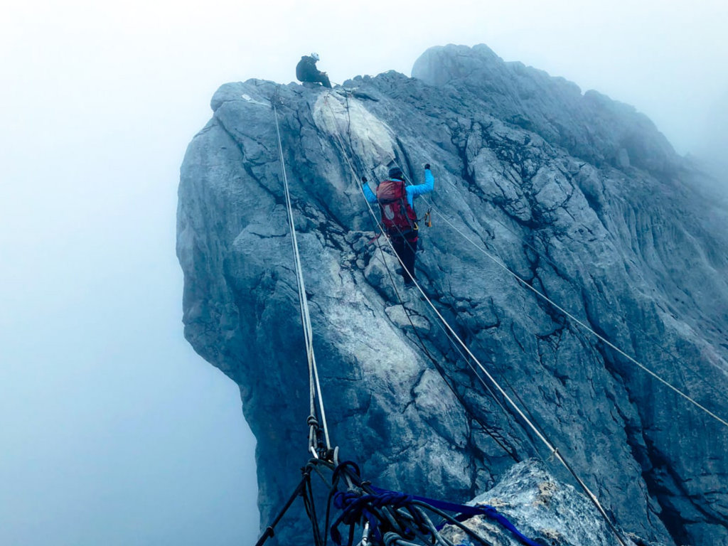 Naik melalui celah vertikal sempit menuju puncak.